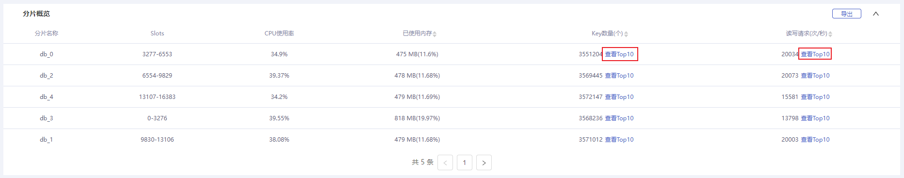 - 分片大Key Top10:点击Key数量后面的查看Top10,展示当前分片中占用内存量前10的大Key。